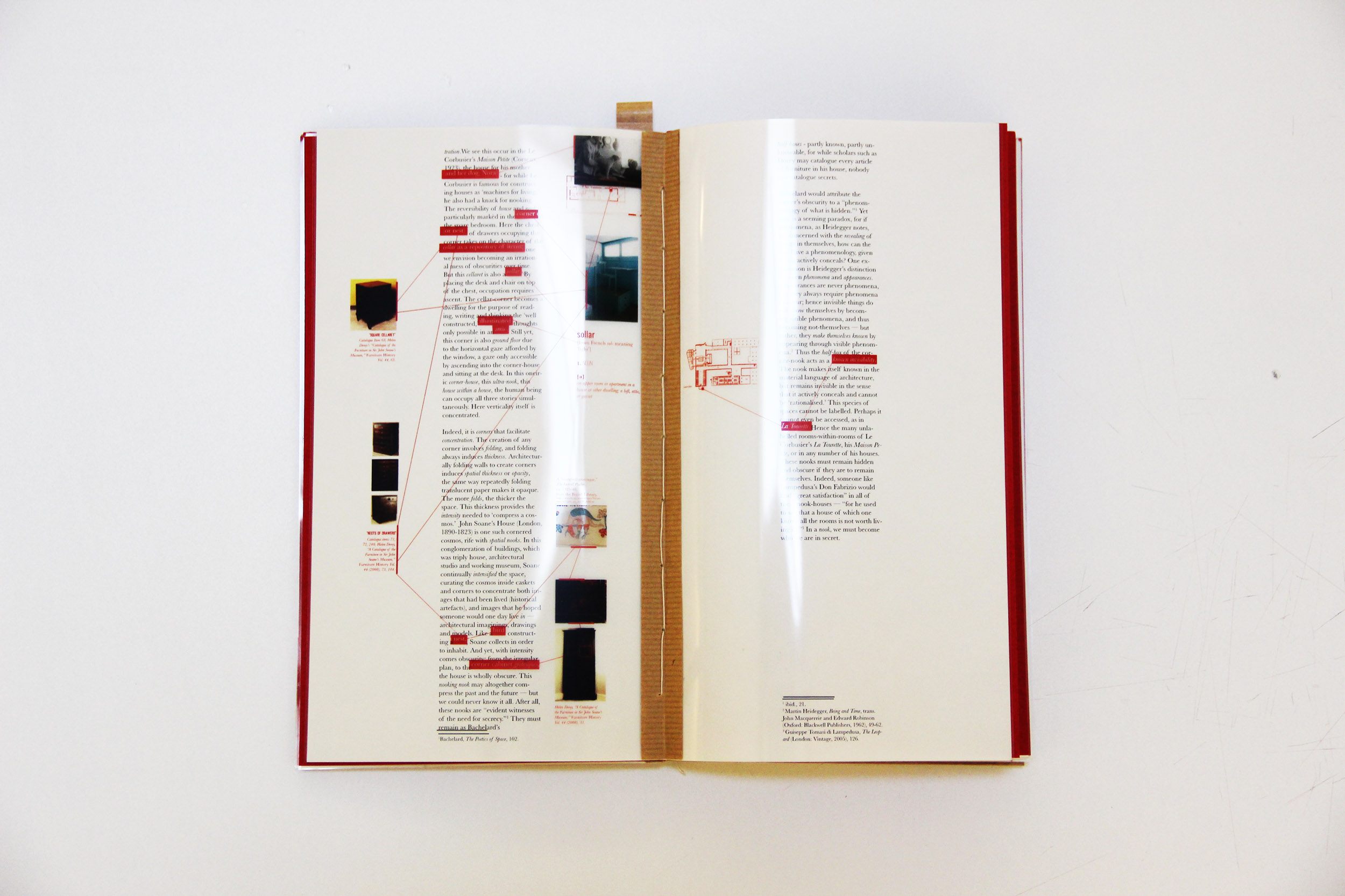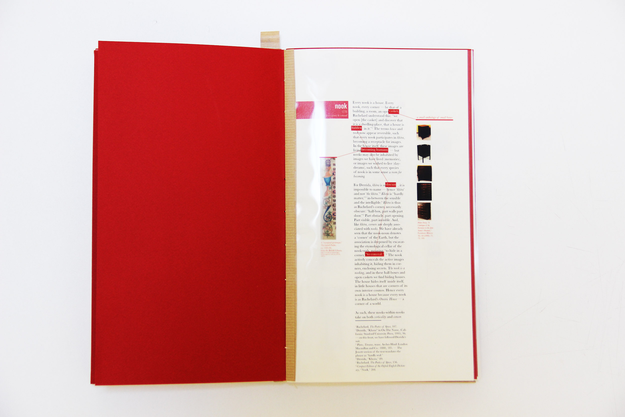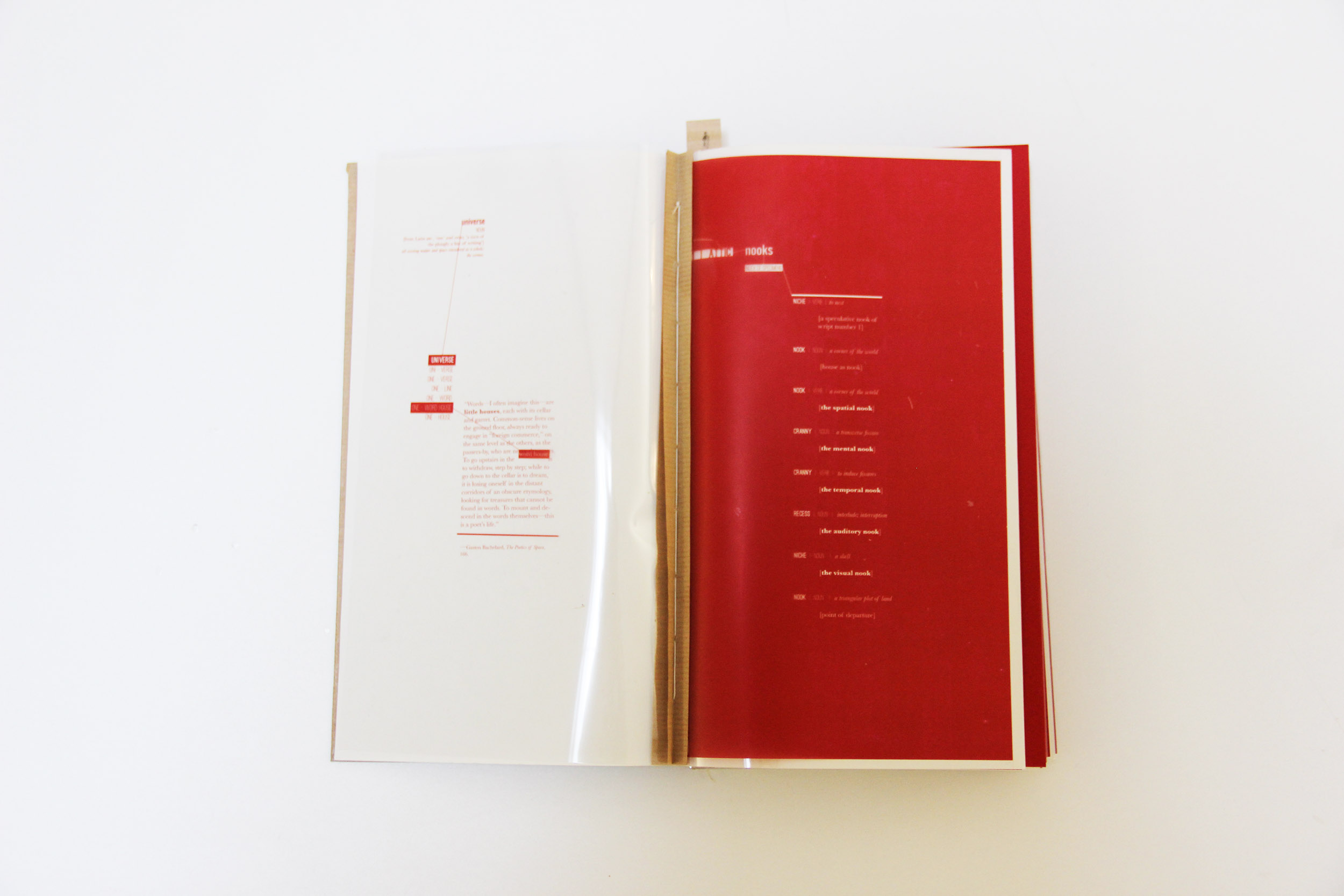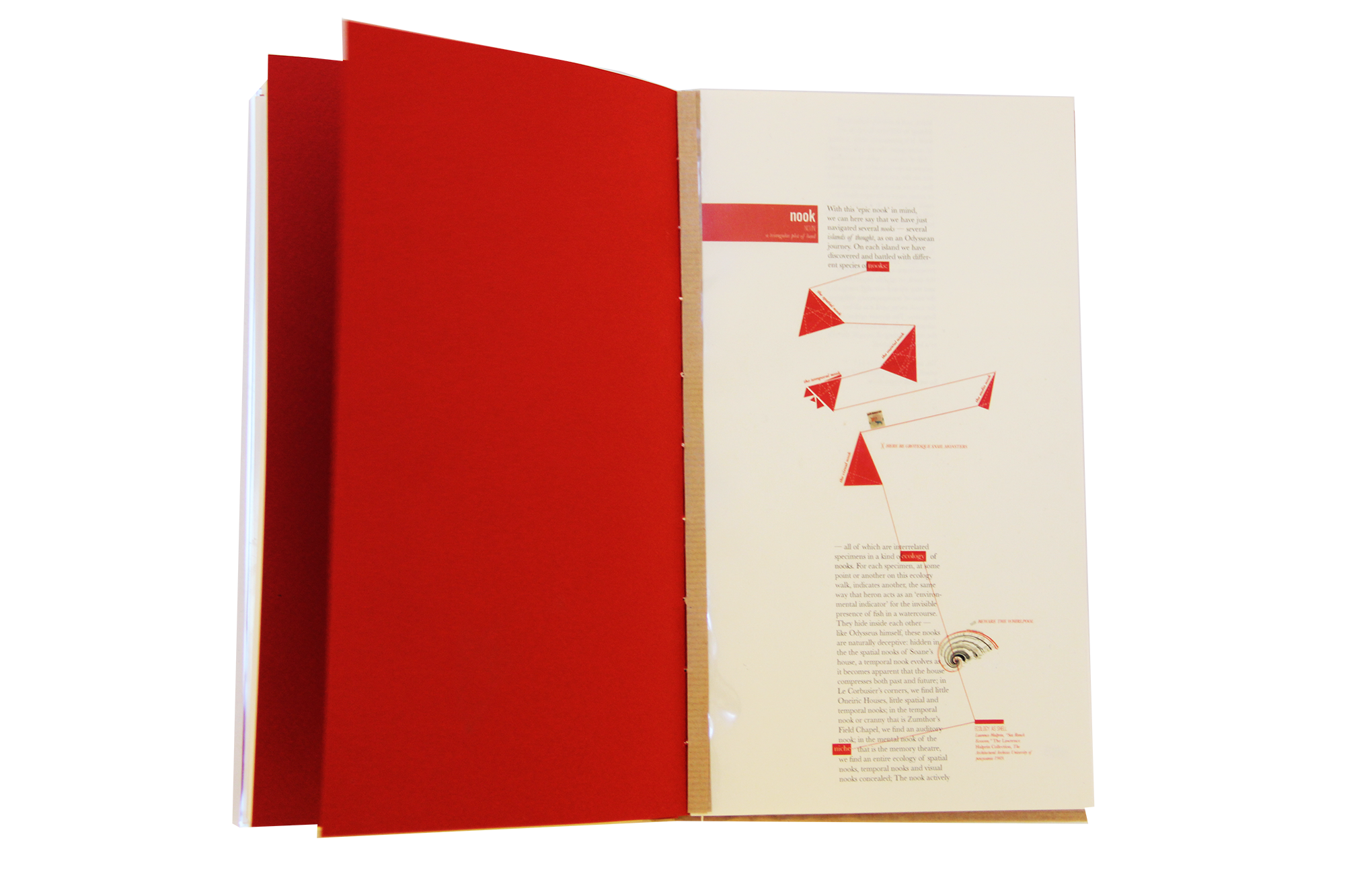 Invoking Bachelard’s Vertical House, the text takes on a tripartite structure of attic, ground floor and cellar. In the Attic, several ‘word houses’ are constructed based on etymological, poetic, phenomenological, literary and architectural examples, each ‘house’ inhabited by a different species of nook. Here the nature and complexity of the nook is disclosed. The Ground Floor explores the nake as the nook’s antithesis via an exploration of Sergei Eisenstein’s never-made film The Glass House, by which the architectural importance of the nook is given greater emphasis and urgency. Following this, the reader enters a cellar: a repository of items indexed from the text for further study; an unfinished inventory from which to invent further ideas.