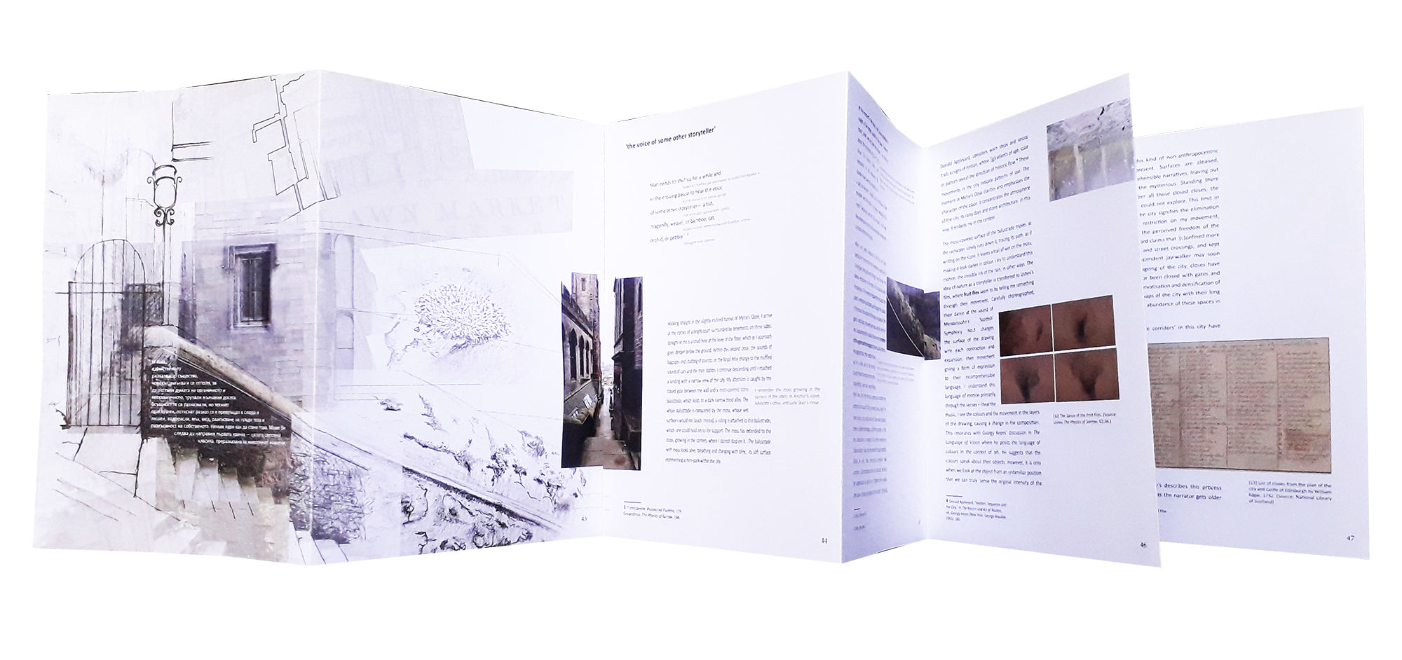 The Edinburgh closes are the most unique characteristic elements of the city’s townscape. They are habitually thought of as hidden, narrow and dark transition spaces and multiple studies on the city have predominantly taken a socio-historical approach to their examination. But how does a stranger, somebody with a completely different way of seeing, explore them and how can this provide a lens to look at them differently? My dissertation attempts to interrupt the way of thinking about the experience of Edinburgh’s closes and the city by looking at them through the ideas presented in Georgi Gospodinov’s book The Physics of Sorrow and Theodore Ushev’s animated film under the same name. By rethinking the idea of the labyrinth and the Minotaur, the two sources open possibilities for a new way of understanding of the city. Following the methodologies of studying the city by Kevin Lynch and Gordon Cullen, the dissertation proposes a rereading of their classical works for the study of urban form. The dissertation demonstrates the potential of the closes as an urban form and how individual memories of other places, experiences of newcomers to the city could inform a new way to study Edinburgh.